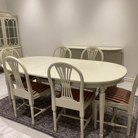 Antik Matgrupp i rokoko stil från 1900-tal bestående av ett runt bord(kan köpas till tillägskivor, dock finns inte med till salu) och 4 stycken stolar. Bordet är målat i en ljus färg med dekorativa sniderier på benen. Stolarna har trästomme med samma ljusa färg och sniderier, samt stoppade sitsar med ett mönstrat tyg i mörka och färgglada toner. Passar som möbel för matsal eller kök.