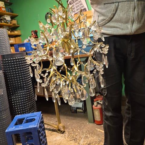 Kristallkrona i lite modernare tappning . Fin inredningsdetalj . Ljushylsorna sköra eller sönder men det går nog att få fatt på nya på nätet . Finns i Nynäshamn .