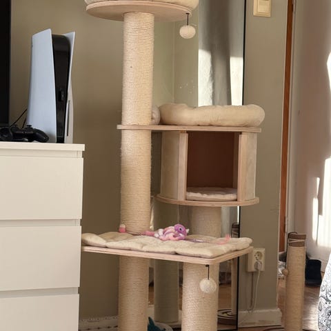 Väldigt fin kattställning med stilren design. Ställningen har mjuk klös matta, inbyggd liten klösrulle, en säng ihop med tre stora bekväma sängar (lite slitage på det sängarna men påverkar inte användningen). Mellanstor modell , varken för liten eller för stor. Perfekt för lek, vila och klös. Fast pris. Finns att hämta i Norrköping.