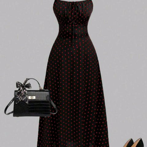 Röd klänning med vita prickar och vit spetskrage. Klänningen har korta ärmar och en längd som når ner till anklarna. Detaljer med spets framtill.