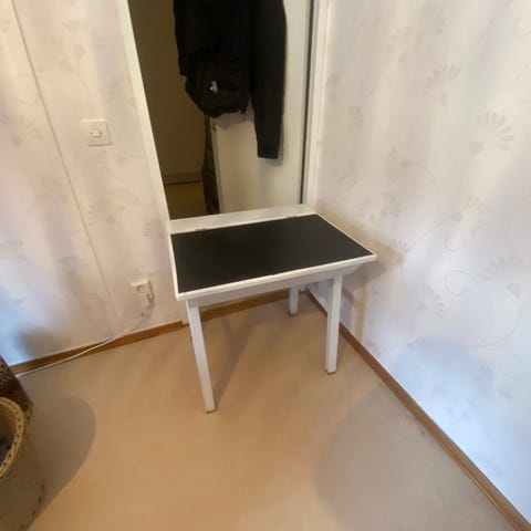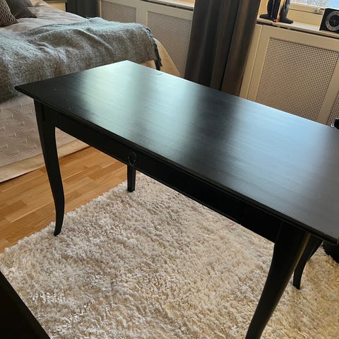 Fint gammaldags skivbord med fina detaljer. Mycket förvaring, ett löst handtag, inget som påverkar användningen. Spegeln ingår ej men går att köpa till för 300 kr, ord 500 kr. Finns i Salem, katt finns i hemmet