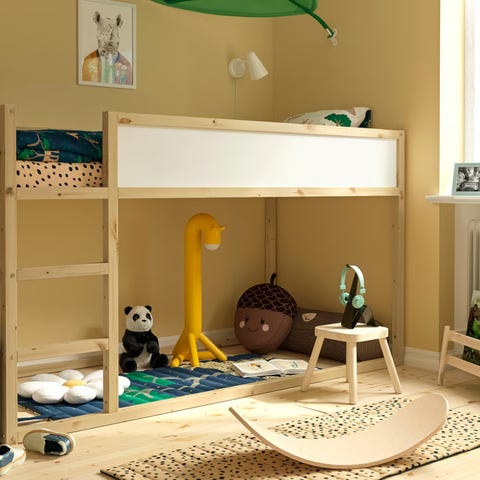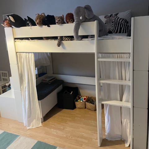 Perfekt lösning för att spara plats – gott om utrymme under sängen för lek, förvaring eller skrivbord. Höjd 157 cm till ”taket” på sängen och total höjd 205 cm.