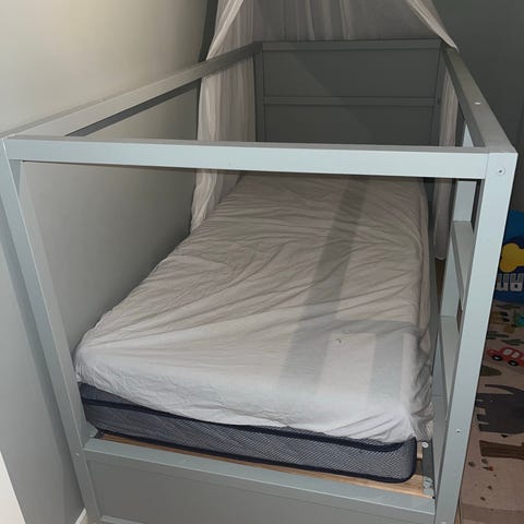 IKEA Loftsäng barnmöbel i grå färg. Sängen är utformad för att spara golvyta genom att ha en upphöjd sovplats med plats under för lek eller förvaring. Passar barn och ungdomar.