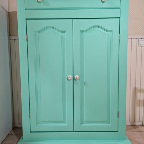 Fint vit skåp med 5 lådor och hyllor.
