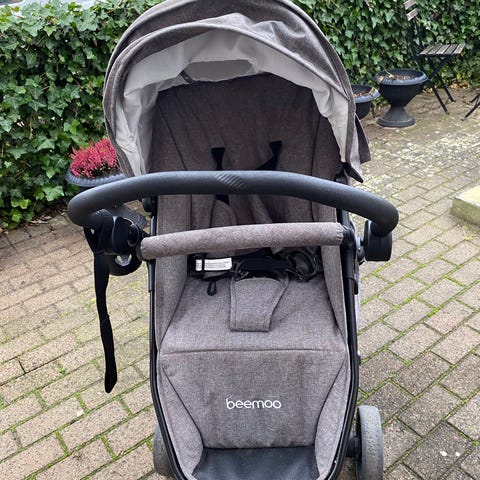 Beemoo barnvagn i grå färg. Barnvagnen har en vadderad sits och ett justerbart handtag med brunt läderliknande material. Den är utrustad med fyra hjul och en förvaringskorg under sitsen.