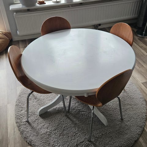 Bordet har inga skador och är i gott skick. 1 stol har inga skador men de andra 3 har börjat flagna som syns på bilderna.