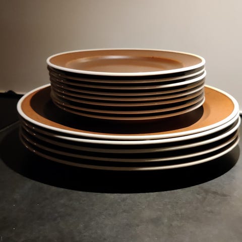 11 stycken stora djupa tallrikar; 5 stycken mindre tallrikar; 3 stycken serveringstallrikar.