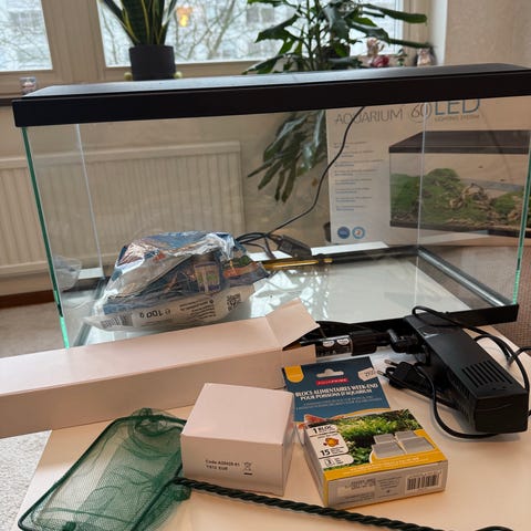 Säljer ett glasakvarium i använt men fungerande skick. Storlek cirka 95 cm långt, 40 cm djupt och 40 cm högt (se bilder med mått). Ingår: