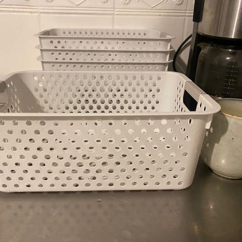 3 förvaringslåda tillverkad i plast med en grå färg. Lådan har ett mönstrat perforerat utförande och är lämplig för förvaring av olika typer av hushållsartiklar.