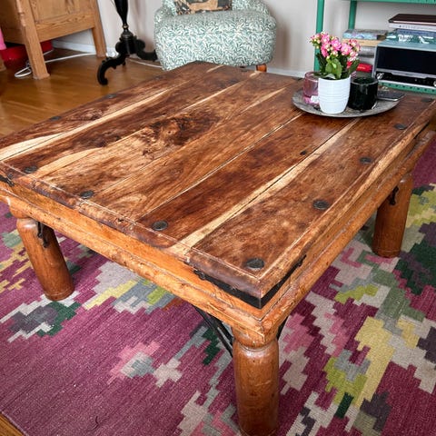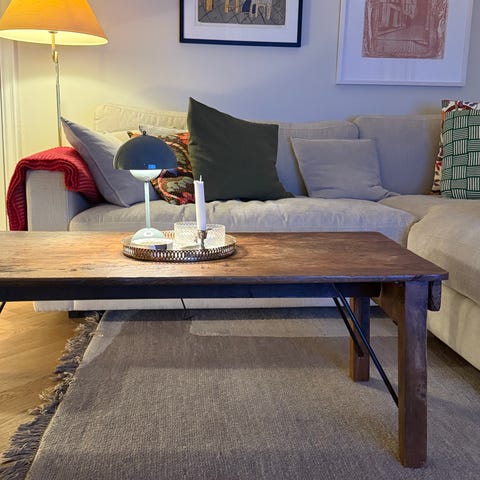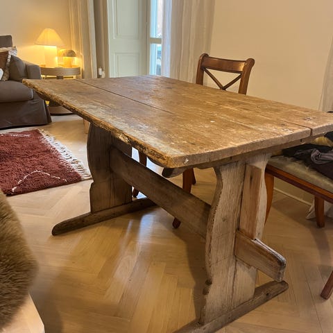 Inhandlat på trampes antik. Ett underbart före detta bakbord med patina som fungerar utmärkt som soffbord.