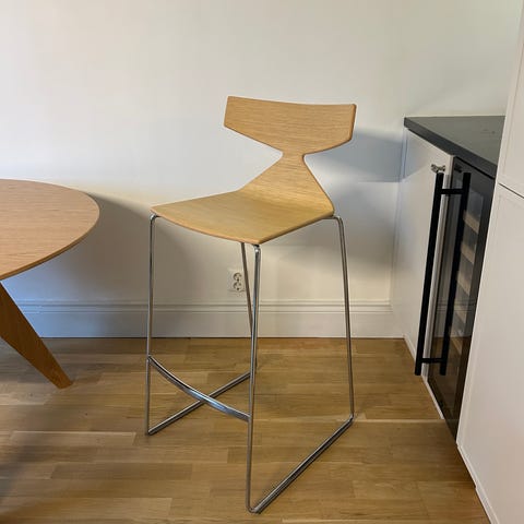 Mycket stilrena minimalistiska barstolar. Nypris 16000 kr st. Den ena har en repor i skinnet. Går behandla enligt läderexpert.