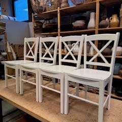 Tre stycken vita köksstolar i trä. Tunga. De har lite avskalad färg här och där.