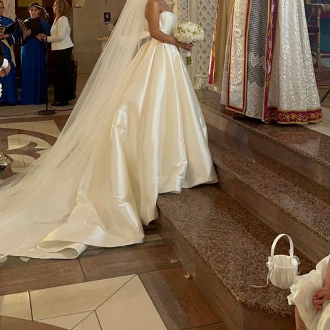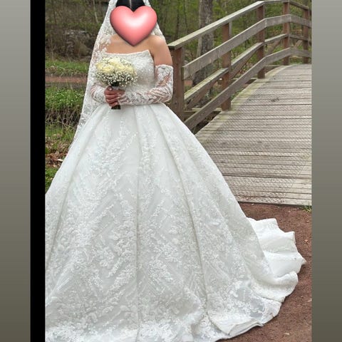 En riktig wow klänning. Nypris 42 000kr. PRONOVIAS bröllopsklänning i off white färg. Klänning med släp (ungefär 2,50/ 3,00 m lång) som kan hakas upp på via en knapp på baksidan. Knapparna på hela ryggen är i samma material som klänningen. Klänningen är kemtvättad direkt efter bröllopet, det finns således inga fläckar eller märken. De går bra att prova klänningen i Skåne. Fler bilder kan skickas vid förfrågan. I samband med köp av klänningen ingår överdraget från PRONOVIAS.