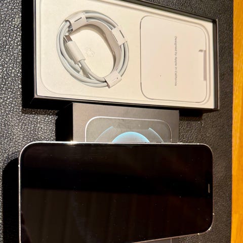 Apple iPhone 12 Pro Max smartphone med 512 GB lagringskapacitet. Enheten har en mörkblå färg och är utrustad med en stor skärm och flera kameror på baksidan. Batterikapaciteten är 82% och den kör iOS version 26.2.