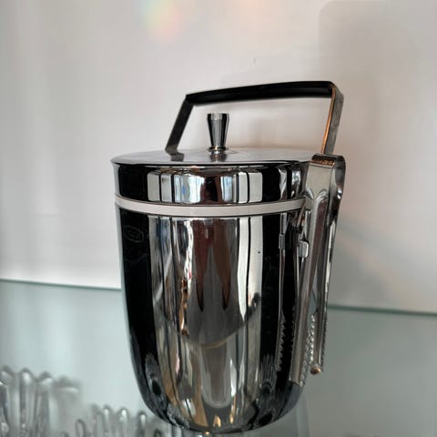 Ishink i klart glas med metallhandtag och tång.