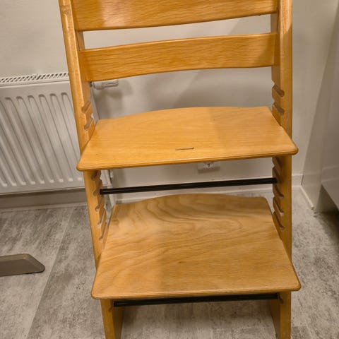Stokke barnstol i trä, utformad för barn. Stolen har justerbar sits och fotstöd för att anpassas efter barnets storlek. Passar för användning vid matbord eller som barnstol vid olika aktiviteter.