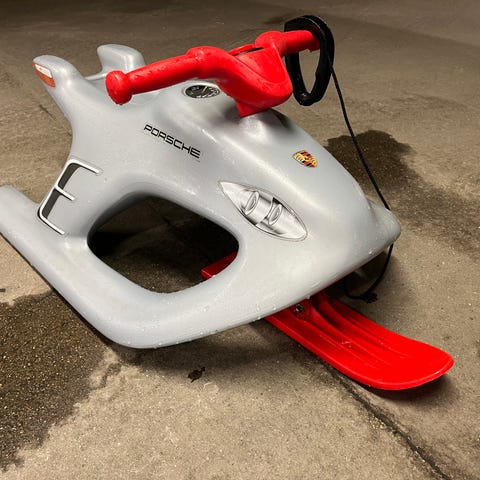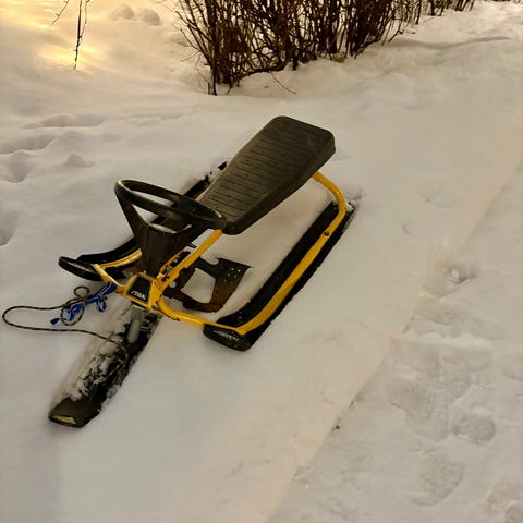 Snowracer/Pulka/Bob med röd ratt och broms-spak 60-tal