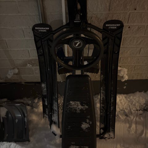 Snowracer i bra skick, allt är original och den går att styra med ratten och bromsa med broms-spaken, den har en fin design från 60-talet och är fabriksbyggd i gediget trä och metall, fungerar perfekt.