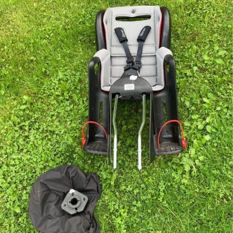 Har ett Hamax-ramfäste att skicka med på köpet, men behövs fortfarande kompletteras med bygelpinnar till att förankra sitsen i fästet som sätts på cykelramen. Går att komplettera med från affär för ca 200 kr.