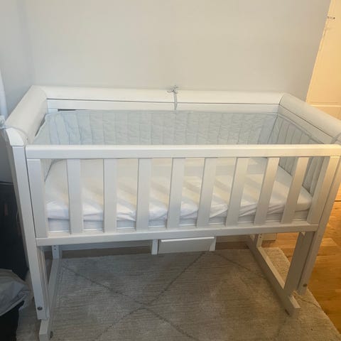 Troll Minisäng bedside crib i vitt trä. Designad för att placeras intill föräldrasängen för enkel åtkomst till barnet. Utrustad med hjul för enkel förflyttning och justerbar höjd för anpassning till olika sänghöjder.