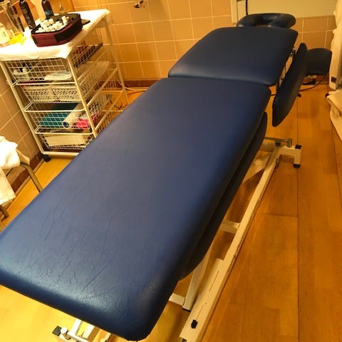 Säljer min T*rsus massagebänk med 70 cm bred brits, 290 lång med möjlighet till förlängning med huvudstöd. Ingår tillbehör såsom armstöd, huvudstöd, knästödrulle. Allt original T*rsus. Bänken är stabil och kan bära upp till 250 kg jämnt fördelad på bänken. Höj- och sänkbar med pedal. (Lägst 55cm - högst 93 cm) Utrymme för pappers-bänkskydd på underställ.