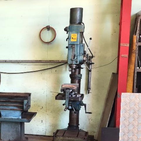 Pelarborrmaskin med arbetsbord och justerbara handtag. Maskinen är avsedd för borrning i olika material och är utrustad med en spindel och en matningsmekanism. Maskinen är placerad i en verkstadsmiljö.