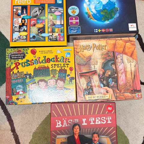 Välbevarad retro-samling med klassiska sällskapsspel och pussel från välkända tillverkare som Kärnan och Ravensburger.