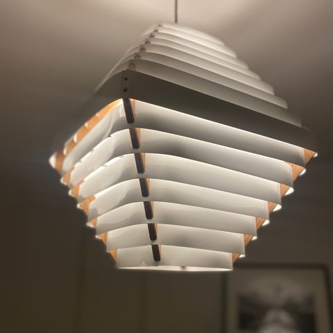 Peter Leek Design lampa tillverkad i valnötsträ och metall. Lampan har en geometrisk form. Lamellerna är vita/ ljust ljust grått. 1950/ 60-tal. Fint skick men lätt bruksslitage pg a ålder. Ca 30 cm bred. Ingen elsladd, endast skärm. Har två lampor till av samma designer i samma stil.