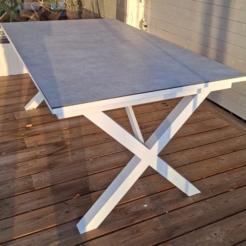 Bordet står just nu ute på vår terass och måste monteras ned för att kunna tas in och fraktas, detta görs av köparen.