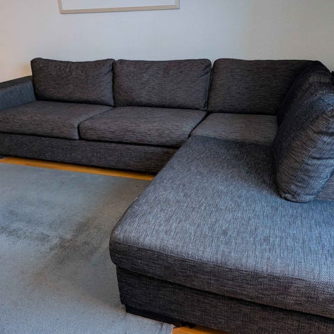 Kvalitetssoffa i grått tyg från Mio med en schäslong del på 151 cm, medan divansidan är 228 cm. Medföljer gör även två flyttbara nackstöd. Vi har katt i hemmet, men hon använder klöspinne så soffan är fortfarande i bra skick.