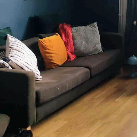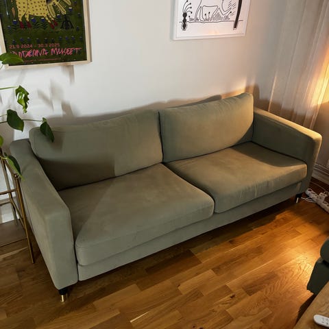 Ikea Karlstad schäslong säljes. Ett helt nytt blått överdrag ingår. Synliga noppor i hörnen på det gamla tyget som sitter på.