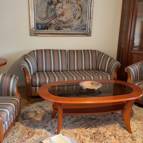 3-sits + 2 Fåtöljer i slitstarkt tyg och mahognychatoser
