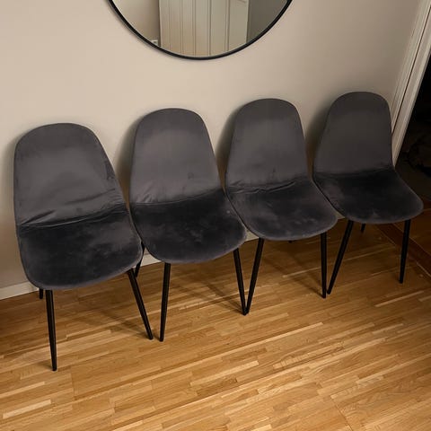 Stolar i sammet. 100 kr st. Finns fyra grå och fyra orange. Alla 600kr
