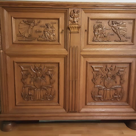 Hand Tillverkad i massiv ek med vacker lackerad finish. Rejäl och tung kvalitetsmöbel med fyra jalusidörrar och fem praktiska lådor upptill – perfekt som förvaring i vardagsrum, hall eller matsal.