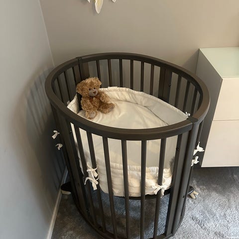 Stokke mini sleepi säng med förlängnings del och den stora madrassen. Sänghimel och sängskydd till lilla delen. Använd i fin skick mitt pris för allt 5000kr