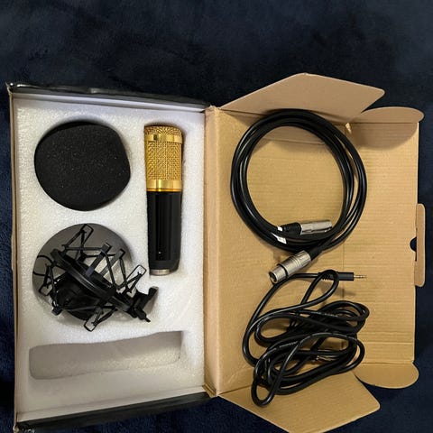 Mikrofon med tillhörande popfilter och xlr kabel. Passar för ljudinspelning och röstupptagning.