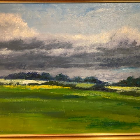 Kurt Ullberger landskapsmålning, oljemålning på duk med motiv av natur och fält. Målningen är signerad och daterad. Inramad i en guldfärgad ram.