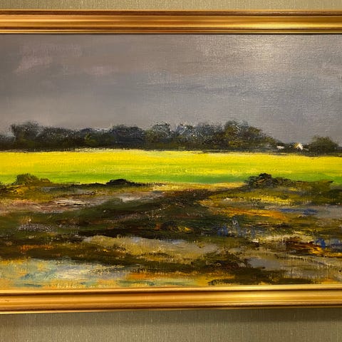 K. Ullberger landskapsmålning i olja på duk från 1978. Målningen föreställer ett landskap med gröna fält och molnig himmel. Inramad med en ram i trä.