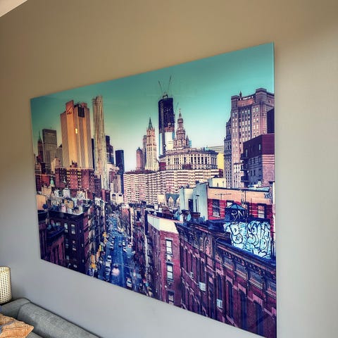 Fototavla med motiv från New Yorks stadsmiljö. Tavlan visar en gatubild med höga skyskrapor, trafikljus och människor. Färgerna är naturliga och detaljrika, vilket ger en realistisk framställning av stadsscenen.