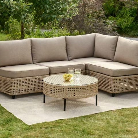 Thise utemöbelset som inkluderar soffgrupp, bord och dynor. Setet är anpassat för utomhusbruk och består av material lämpade för trädgård eller uteplats. Möbelsetet har en neutral färg och är designat för att ge sittplatser och bordsyta i ett sammanhängande paket.