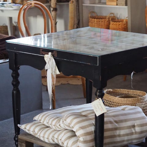 Den stora kassadisken har ett hål till sladdar för kassaapparat uppe på skivan.