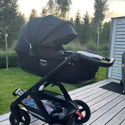 En underbar vagn med robust och stadig, där barnet sitter högt. Extra lång sufflett. Finns ventilation både på liggdelen och sittdelen. Sittdelen är ergonomisk och justerbar. Vagnen har försvarats inomhus. Vad som ingår: Regnskydd och myggnät.