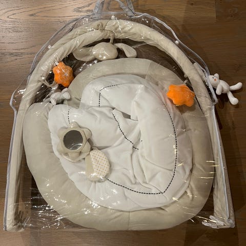 Babysom lätt kan placeras över lekmatta eller annat. Man kan själv hänga dit egna leksaker som barnet tycker om.