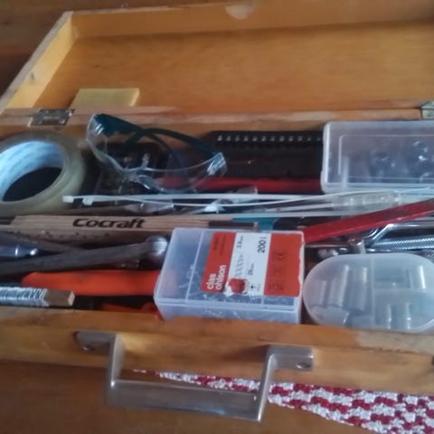 Diverse mek prylar, bygglampa,gersåg ,handverktyg,12 v dammsugare, 220v Polermaskin ,220v borrslip , 1 st oöppnad påse med 50st slangklämmor m .m