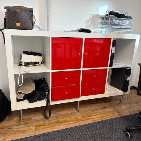 IKEA Kallax förvaringshylla med svartvita luckor. Hyllan har flera fack för förvaring och är lämpad för olika typer av kontorsmaterial eller böcker. Den är tillverkad i robust material och har en enkel, modern design som passar i olika miljöer.