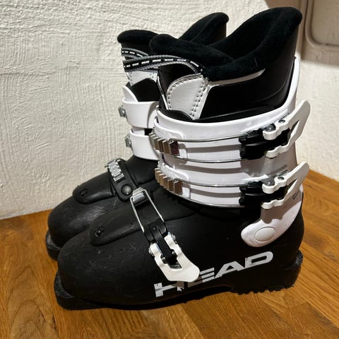 Head skidpjäxor i svart med gula spännen, storlek 22.0-22.5. Pjäxorna är anpassade för barn och har fyra spännen för justerbar passform.