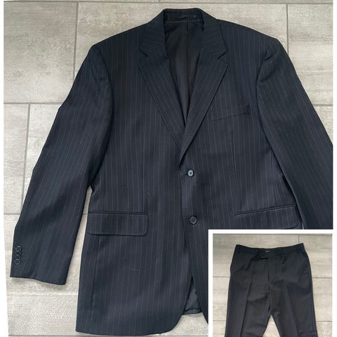 En välskött kostym som är mycket mörkt blå med kritstreck. Storlek 152