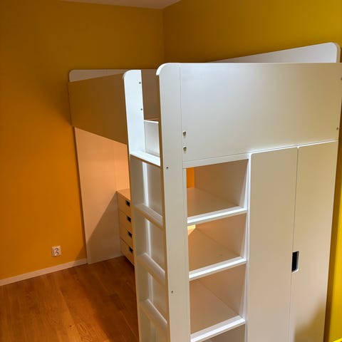 IKEA SMÅSTAD Loftsäng med integrerad förvaring och skrivbord. Sängen har en stege, hyllor och garderobsutrymme, vilket ger flera funktioner i ett kompakt format. Passar för barnrum och erbjuder både sovplats och arbetsyta. Tillverkad i vitt material.