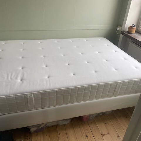 Säljer en bekväm säng i storlek 140 cm, perfekt som dubbelsäng i mindre sovrum, gästrum eller vind. Sängen har ett stilrent och ombonat uttryck och passar bra i rum med snedtak eller begränsat utrymme, som på bilden.