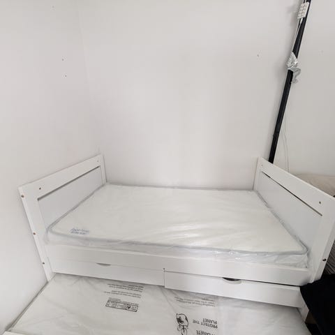 Äldre växasäng. Mycket robust och stabil. Är synligt använd med slitage i färgen samt några klistermärken.